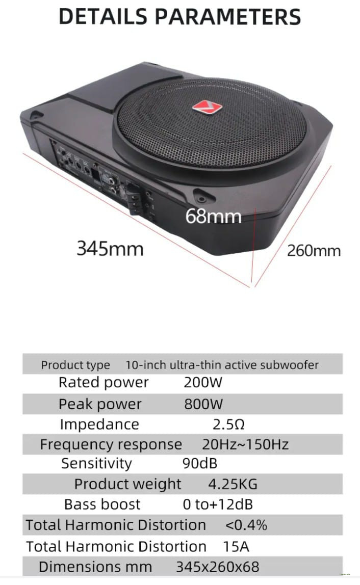 10 inch 800W under seat auto audio subwoofer modified 12V big power amplifier slim car subwoofer