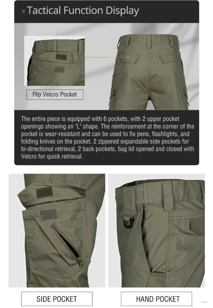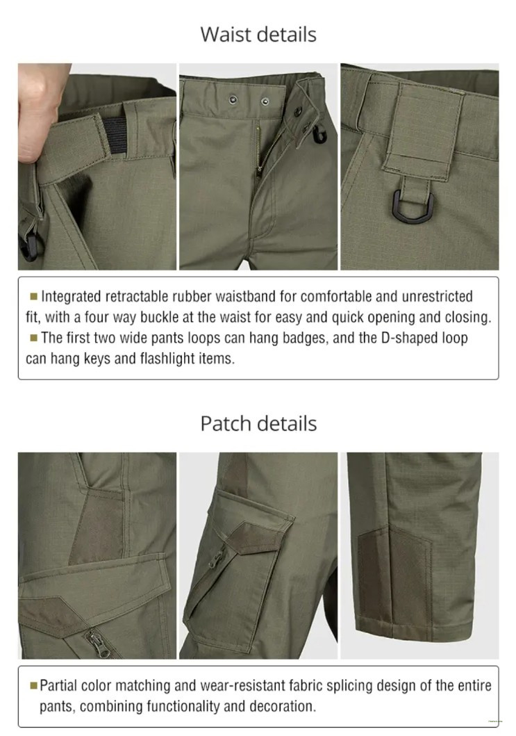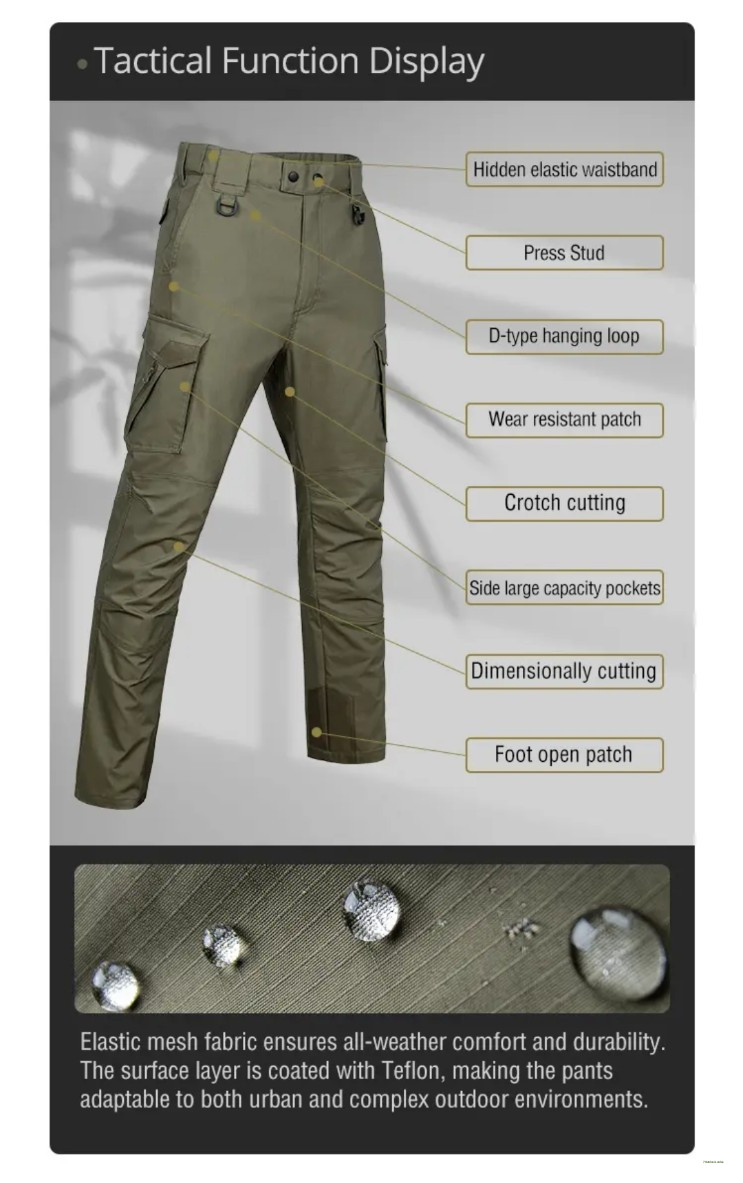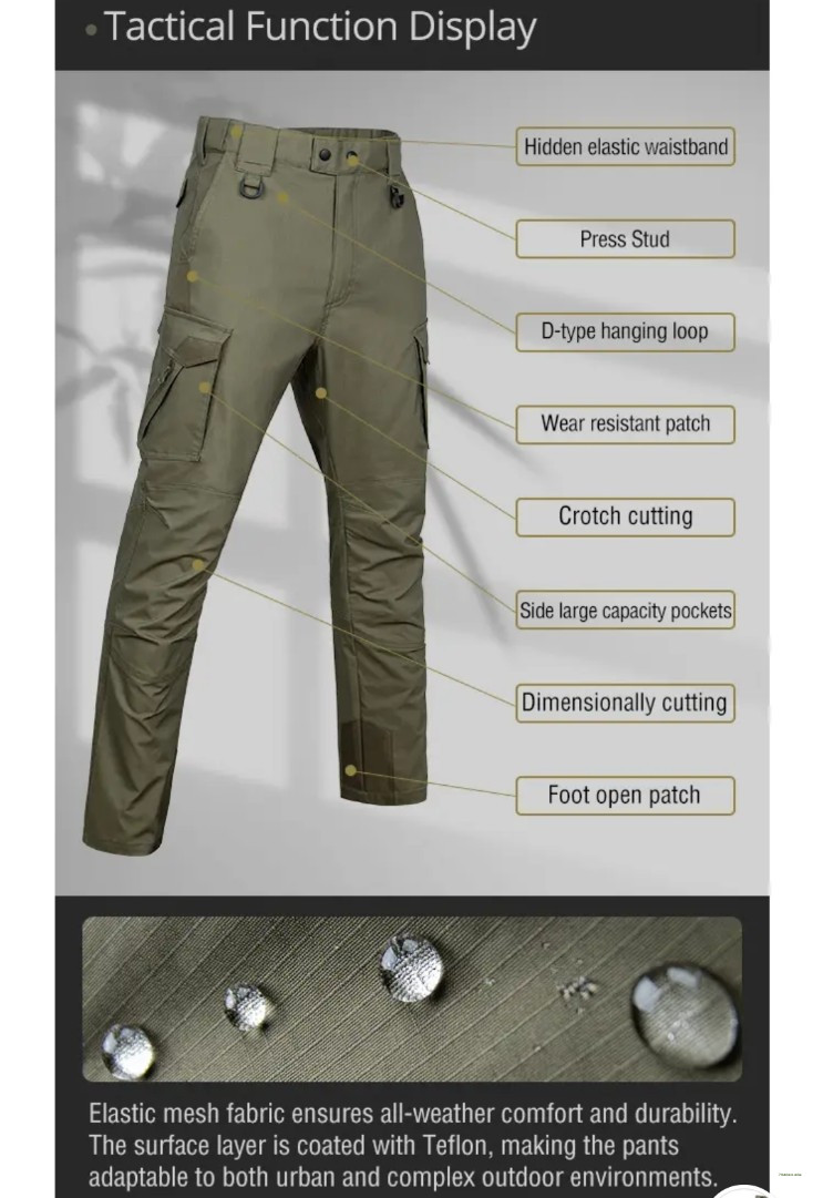 Introducing the SN75 Tactical Pants: the ultimate gear for demanding environments. These pants are waterproof, keeping you dry in wet conditions. They're made with antiwear and antistain fabric, ensuring they stay durable and look clean through rigorous use. The anti wrinkle feature means they maintain a sharp, professional appearance, while the breathable material ensures comfort during extended wear. Plus, the elastic material offers flexibility and ease of movement. Perfect for professionals and outdoor enthusiasts alike, SN75 Tactical Pants combine practicality and performance seamlessly.